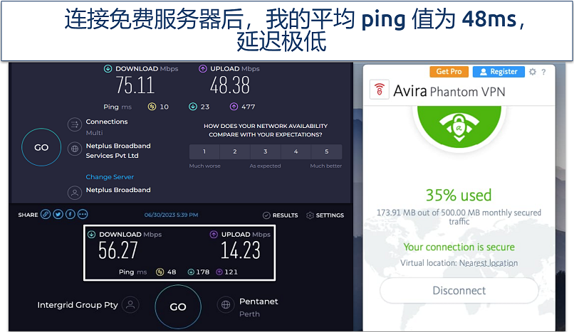 Avira Phantom VPN 支持同时连接无限台设备,这在免费 VPN 当中十分少见。你可以在任何设备上畅玩 Roblox,无需中断现有的 VPN 连接。在测试过程中,我可以轻松地在安卓手机、iPad 和其他 3 台设备上连接到免费的珀斯服务器。我的网速没有变慢,连接十分稳定,Ping 值从未超过 48ms。