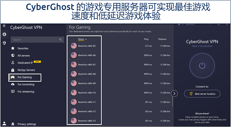- 应用程序易于使用:CyberGhost 是入门用户的理想选择。游戏专用服务器很容易找,整个应用程序界面直观且对用户友好。如需帮助,可联系其全天候实时聊天客服。