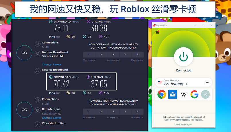 在我的测试中,ExpressVPN 的表现完胜其他 VPN。用它玩游戏网速非常稳定,ping 值在我测试过的所有 VPN 中最低。我在美国期间进行了所有测试,连接美国服务器时 ping 值最低,只有 27ms,网速达到了 70.42Mbps。大多数 VPN (尤其是免费 VPN)会让连接速度下降超过 50%。但 ExpressVPN 的速度降幅仅约 6%。用游戏笔记本电脑玩 Roblox 时我没有遇到任何卡顿。