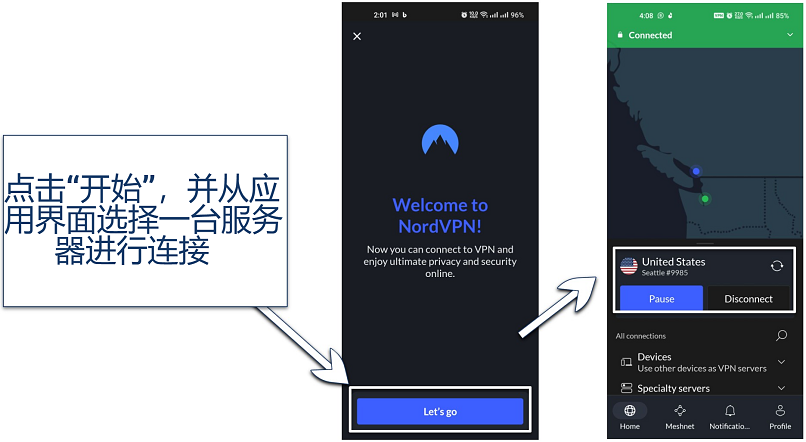 - 试用NordVPN 7天。第一次启动应用时可能需要授予NordVPN一些权限。