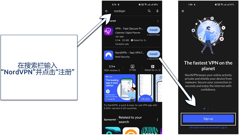 - 安装NordVPN应用程序。 要找到NordVPN应用,可以访问该VPN的官方网站。或者,直接去谷歌商店,在搜索栏里输入"NordVPN”,然后点击安装。应用安装后,点击"注册(Sign Up)”以开始。