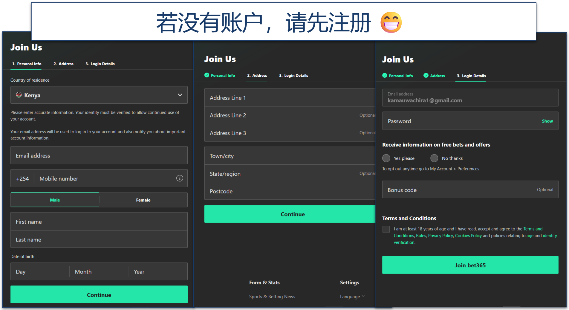 连接到 bet365 注册时所在地区的服务器,这样可以确保投注行为正常,降低触发安全警报的风险。我曾经在度假时开通体育博彩账户,没意识到这样做可能引发后续问题,而在所在国家注册账户能省去很多麻烦。(bet365怎么注册)