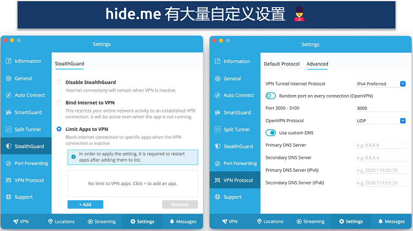 - 能在中国可靠运行。多种安全协议选择很加分。假如其中一种协议被封锁,还可以使用其他协议。流量混淆功能(也称为 Stealth)可以隐藏 VPN 使用活动,并将VPN流量伪装成常规网络流量,从而避开封锁。自定义DNS设置则可以避开 DNS层面的封锁。