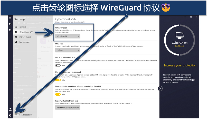 - 下载提供 WireGuard 协议的 VPN。我推荐CyberGhost,因为它不仅几分钟就能安装好并开始使用,其强悍的安全功能还可以保护用户线上身份和活动的隐私安全;CyberGhost 提供 45 天退款保证。
