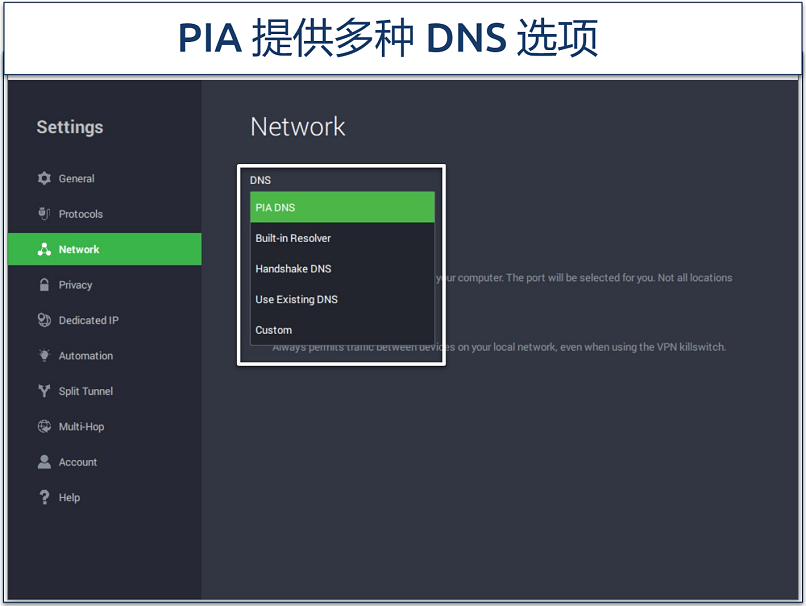 - 拆分隧道。PIA 支持用户选择哪些应用通过 VPN 隧道传输流量,哪些使用常规互联网连接传输。如果你想用 VPN 安全下载种子文件,同时用真实 IP 地址使用本地网银服务,这项功能将会非常实用。