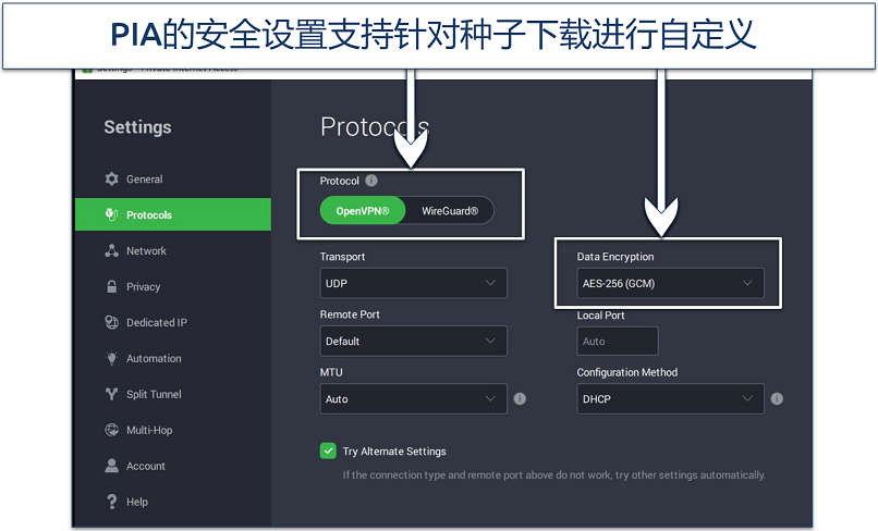 PIA 还具备强大的安全功能,包括 AES 256 加密算法和两种安全开关选项。此外,你可以在不同安全协议(包括 WireGuard 和 OpenVPN)及加密级别之间进行切换。虽然 OpenVPN 是公认最安全的协议,但我更喜欢用速度更快的 WireGuard。