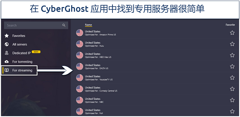 CyberGhost 提供流媒体、种子下载和游戏专用服务器,支持同时连接 7 台设备。我的英国同事可以在电脑上登录 Netflix 英国观看《一天》(One Day),同时用笔记本电脑下载的公域怀旧科幻电影,而他的室友则可以连接英国服务器看 BBC iPlayer。他们都没有察觉到有明显的减速问题。此外,CyberGhost 的专用服务器还支持多个 Netflix 媒体库、Hulu、Max、DAZN 和 Amazon Prime Video。