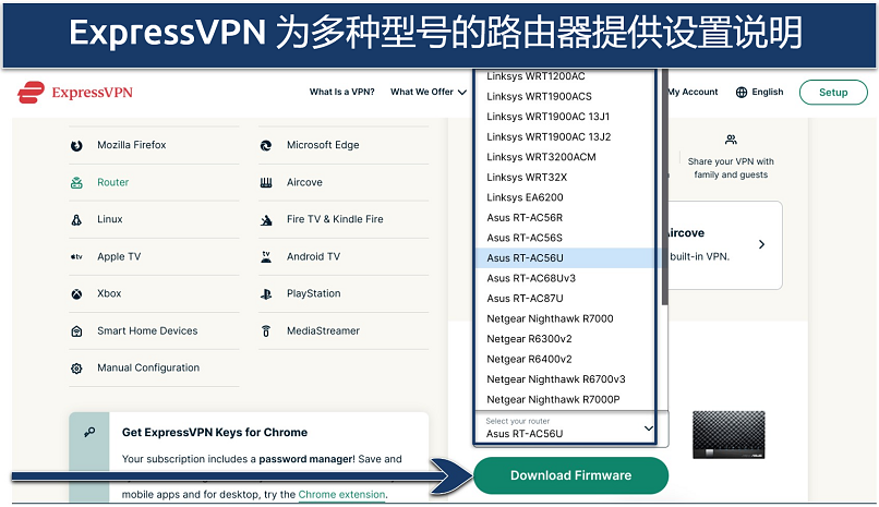 例如,ExpressVPN 就提供有自定义固件和路由器原生应用,而且它的应用兼容多种类型的路由器。它的官网为每种路由器提供了详细的安装和设置指南,方便用户更便捷地安装软件。如果遇到任何疑问,都可以全天候寻求客服的帮助。