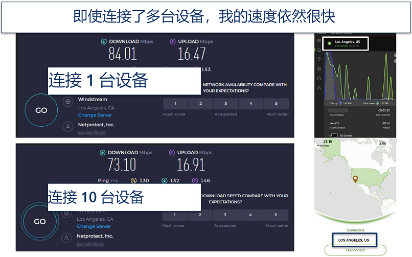 凭借卓越的速度,ExpressVPN 成为了同时在多台设备上进行带宽密集型活动的首选。我连接了周边及远距离服务器进行了测试 。结果表明,ExpressVPN 是我测试过的速度最快的 VPN。我将 iPhone、iPad、安卓机、笔记本电脑和 PC 连接到了同一台服务器,速度仅下降 12%。这样的表现令人印象深刻。因为连接多台设备时,许多 VPN 会大幅降低网速(降幅高达 80%)。