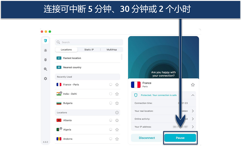 其暂停 (Pause) 功能可优化日常上网体验。该功能可将 VPN 暂停一段时间,从而避免验证码和在访问位置敏感服务(如网银)时遇到问题,之后再恢复 VPN 连接。我在 Windows 笔记本电脑上使用网银账户时,就将 Surfshark 连接中断了 30 分钟。之后 VPN 顺利重连了。